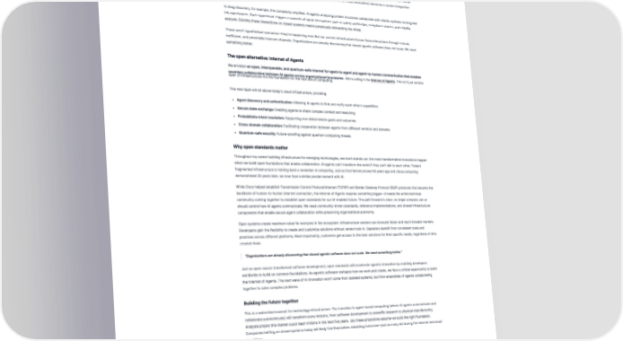 Every generation of computing faces the same pivotal choice: build walls or build bridges. When the internet was young, proprietary networks promised control and predictability—those systems are now museum exhibits. Open protocols succeeded by enabling global collaboration and innovation. When cloud computing emerged, open standards like Kubernetes won by creating an ecosystem where thousands of companies could build, innovate, and scale together. Now, as Agentic AI transforms computing once again, we face the same choice: build it open, or build it twice. Subscribe to the Shift! Why we’re at a crossroads Today's infrastructure was built for humans sharing content like websites, emails, and videos. But artificial intelligence (AI) agents are Get emerging insights on innovative technology fundamentally different. They don't just share information; they collaborate, reason, and take autonomous actions in real-time. More straight to your inbox. importantly, they introduce probabilistic computing into our technological foundation. This shift from deterministic to probabilistic computing represents a profound change in how we build and deploy technology. The real question isn't whether to build new infrastructure—it's whether we'll learn from history or repeat it. Subscribe to newsletter Consider two real-world examples emerging today: In enterprise IT, deploying a sales forecasting SaaS platform requires collaboration across multiple AI agents. A planner agent decomposes business requirements into specific build tasks, while ServiceNow agents coordinate with Salesforce and Hubspot systems for deployment. Infrastructure agents from Cisco and Microsoft simultaneously validate security, identity and access, costs, and SLO compliance. This all requires sophisticated agent-to-agent reasoning and without open standards, each of these interactions becomes a custom integration project. In drug discovery, for example, the complexity amplifies. AI agents analyzing protein structures collaborate with robotic systems running wet lab experiments. Each experiment triggers a cascade of agent interactions such as safety verification, compliance checks, and stability analysis. Building these interactions on closed systems means perpetually reinventing the wheel. These aren't hypothetical scenarios—they're happening now. But our current infrastructure forces these interactions through manual, inefficient, and potentially insecure channels. Organizations are already discovering that closed agentic software does not scale. We need something better. The open alternative: Internet of Agents We envision an open, interoperable, and quantum-safe Internet for agent-to-agent and agent-to-human communication that enables seamless collaboration between AI agents across organizational boundaries. We're calling it the Internet of Agents. This isn't just another layer of infrastructure–it's the foundation for the next era of computing. This new layer will sit above today's cloud infrastructure, providing: € Agent discovery and authentication: Allowing AI agents to find and verify each other's capabilities € Secure state exchange: Enabling agents to share complex context and reasoning € Probabilistic intent resolution: Supporting non-deterministic goals and outcomes € Cross-domain collaboration: Facilitating cooperation between agents from different vendors and domains € Quantum-safe security: Future-proofing against quantum computing threats Why open standards matter Throughout my career building infrastructure for emerging technologies, one truth stands out: the most transformative innovations happen when we build open foundations that enable collaboration. AI agents can't transform the world if they can't talk to each other. Today's fragmented infrastructure is holding back a revolution in computing. Just as the Internet proved 40 years ago and cloud computing demonstrated 20 years later, we now face a similar pivotal moment with AI. While Cisco helped establish Transmission Control Protocol/Internet (TCP/IP) and Border Gateway Protocol (BGP) protocols that became the backbone of human-to-human internet connection, the Internet of Agents requires something bigger—it needs the entire technical community coming together to establish open standards for our AI-enabled future. The path forward is clear: no single company can or should control how AI agents communicate. We need community-driven standards, reference implementations, and shared infrastructure components that enable secure agent collaboration while preserving organizational autonomy. Open systems create maximum value for everyone in the ecosystem. Infrastructure vendors can innovate faster and reach broader markets. Developers gain the flexibility to create and customize solutions without vendor lock-in. Operators benefit from consistent tools and practices across different platforms. Most importantly, customers get access to the best solutions for their specific needs, regardless of who created them. “Organizations are already discovering that closed agentic software does not scale. We need something better.” Just as open source transformed software development, open standards will accelerate agentic innovation by enabling developers worldwide to build on common foundations. As agentic software reshapes how we work and create, we face a critical opportunity to build the Internet of Agents. The next wave of AI innovation won't come from isolated systems, but from ensembles of agents collaborating together to solve complex problems. Building the future together This is a watershed moment for technology infrastructure. The transition to agent-based computing (where AI agents communicate and collaborate autonomously) will transform every industry, from software development to scientific research to physical manufacturing. Analysts project this market could reach trillions in the next five years. But these projections assume we build the rig