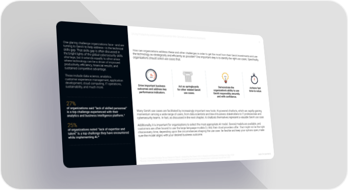 Driving Productivity and Improved Outcomes With Generative AI-powered Assistants 8 One glaring challenge organizations face—and are turning to GenAI to help address—is the technical How can organizations address these and other challenges in order to get the most from their GenAI investments and use skills gap. That skills gap is often discussed in the bright lights of the global cybersecurity skills the technology as strategically and efÏciently as possible? One important step is to identify the right use cases. Specifically, shortage, but it extends equally to other areas organizations should select use cases that: where technology can be a driver of improved productivity, efÏciency, financial results, and sustained competitive advantage. These include data science, analytics, customer experience management, application development, cloud computing, IT operations, Drive important business Act as springboards Demonstrate the Achieve fast sustainability, and much more. outcomes and address key for other related GenAI organization’s ability to use time-to-value. performance indicators. use cases. GenAI responsibly, securely, and with confidence. 27% of organizations said “lack of skilled personnel” Many GenAI use cases are facilitated by increasingly important new tools: AI-powered chatbots, which are rapidly gaining is a top challenge experienced with their momentum among a wide range of users, from data scientists and line-of-business stakeholders to IT professionals and analytics and business intelligence platform.7 cybersecurity teams. In fact, as discussed in the next chapter, AI chatbots themselves represent a valuable GenAI use case. 25% Additionally, it is important for organizations to select the most appropriate AI model. Several models are available, and of organizations noted “lack of expertise and customers are often bound to use the large language models (LLMs) their cloud providers offer. That might not be the right talent” is a top challenge they have encountered choice every time, depending upon the circumstances shaping the use case. Be flexible and keep your options open; make while implementing AI.8 sure the model aligns with your desired business outcome. © 2024 TechTarget, Inc. All Rights Reserved. 7Source: Enterprise Strategy Group, Research Report, Unleashing the Power of AI in Analytics and Business Intelligence, May 2024. 8Source: Enterprise Strategy Group, Research Report, Navigating the Evolving AI Infrastructure Landscape, September 2023 Back to contents