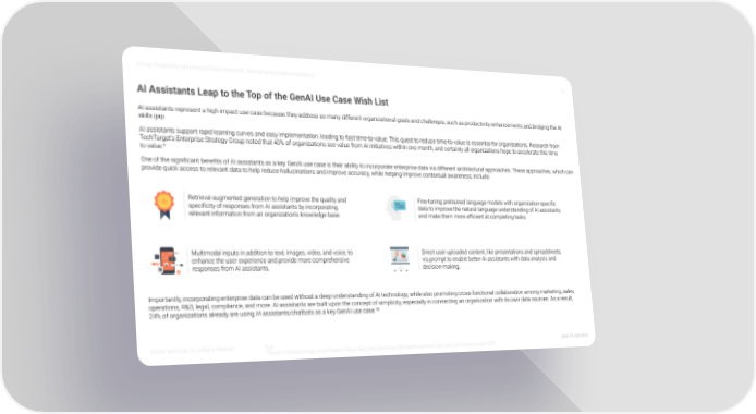 Driving Productivity and Improved Outcomes With Generative AI-powered Assistants 10 AI Assistants Leap to the Top of the GenAI Use Case Wish List AI assistants represent a high-impact use case because they address so many different organizational goals and challenges, such as productivity enhancements and bridging the AI skills gap. AI assistants support rapid learning curves and easy implementation, leading to fast time-to-value. This quest to reduce time-to-value is essential for organizations. Research from TechTarget’s Enterprise Strategy Group noted that 40% of organizations see value from AI initiatives within one month, and certainly all organizations hope to accelerate this time to value.9 One of the significant benefits of AI assistants as a key GenAI use case is their ability to incorporate enterprise data via different architectural approaches. These approaches, which can provide quick access to relevant data to help reduce hallucinations and improve accuracy, while helping improve contextual awareness, include: Retrieval-augmented generation to help improve the quality and Fine-tuning pretrained language models with organization-specific specificity of responses from AI assistants by incorporating data to improve the natural language understanding of AI assistants relevant information from an organization’s knowledge base. and make them more efÏcient at completing tasks. Multimodal inputs in addition to text, images, video, and voice, to Direct user-uploaded content, like presentations and spreadsheets, enhance the user experience and provide more comprehensive via prompt to enable better AI assistants with data analysis and responses from AI assistants. decision-making. Importantly, incorporating enterprise data can be used without a deep understanding of AI technology, while also promoting cross-functional collaboration among marketing, sales, operations, R&D, legal, compliance, and more. AI assistants are built upon the concept of simplicity, especially in connecting an organization with its own data sources. As a result, 24% of organizations already are using AI assistants/chatbots as a key GenAI use case.10 © 2024 TechTarget, Inc. All Rights Reserved. 9Ibid. Back to contents 10Source: Enterprise Strategy Group Research Report, Beyond the GenAI Hype: Real-world Investments, Use Cases, and Concerns, August 2023.