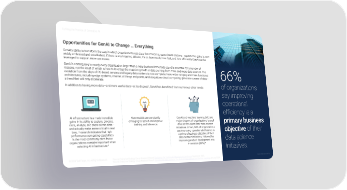 Fulfilling the Promise of Generative AI 6 Opportunities for GenAI to Change … Everything GenAI’s ability to transform the way in which organizations use data for economic, operational, and even reputational gains is now widely embraced and established. If there is any lingering debate, it’s on how much, how fast, and how efÏciently GenAI can be leveraged to support more use cases. GenAI’s coming role in nearly every organization larger than a neighborhood lemonade stand is essential for a number of reasons, not the least of which is how to leverage the massive growth in data coming from more and more data sources. The evolution from the days of PC-based servers and legacy data centers is now complete: New, wider-ranging and more functional architectures, including edge systems, internet of things endpoints, and ubiquitous cloud computing, generate oceans of data— 66% a trend that will only accelerate. In addition to having more data—and more useful data—at its disposal, GenAI has benefitted from numerous other trends: of organizations say improving operational efÏciency is a AI infrastructure has made incredible New models are constantly GenAI and machine learning (ML) are gains in its ability to capture, process, emerging to speed and improve major shapers of organizations’ overall store, analyze, and share all this data— training and inference. drive to transform their data science primary business and actually make sense of it all in real initiatives. In fact, 66% of organizations time. Research indicates that high- say improving operational efÏciency is objective of their performance computing capabilities a primary business objective of their is the most commonly cited factor data science initiatives, followed by organizations consider important when improving product development and data science selecting AI infrastructure.³ innovation (60%).4 initiatives. © 2024 TechTarget, Inc. All Rights Reserved. ³Source: Enterprise Strategy Group Research Report, Navigating the Evolving AI Infrastructure Landscape, September 2023. 4Source: Enterprise Strategy Group Research Report, Decoding the Data Universe: The State of Data Science and Machine Learning, January 2024. Back to contents