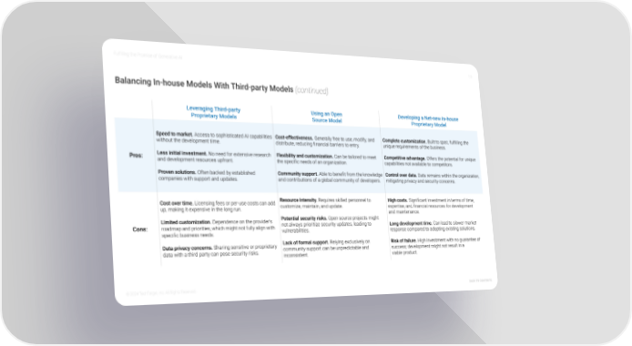 Fulfilling the Promise of Generative AI 13 Balancing In-house Models With Third-party Models (continued) Leveraging Third-party Using an Open Developing a Net-new In-house Proprietary Models Source Model Proprietary Model Speed to market. Access to sophisticated AI capabilities Cost-effectiveness. Generally free to use, modify, and Complete customization. Built to spec, fulfilling the without the development time. distribute, reducing financial barriers to entry. unique requirements of the business. Pros: Less initial investment. No need for extensive research Flexibility and customization. Can be tailored to meet Competitive advantage. Offers the potential for unique and development resources upfront. the specific needs of an organization. capabilities not available to competitors. Proven solutions. Often backed by established Community support. Able to benefit from the knowledge Control over data. Data remains within the organization, companies with support and updates. and contributions of a global community of developers. mitigating privacy and security concerns. Cost over time. Licensing fees or per-use costs can add Resource intensity. Requires skilled personnel to High costs. Significant investment in terms of time, up, making it expensive in the long run. customize, maintain, and update. expertise, and financial resources for development and maintenance. Limited customization. Dependence on the provider’s Potential security risks. Open source projects might Cons: roadmap and priorities, which might not fully align with not always prioritize security updates, leading to Long development time. Can lead to slower market vulnerabilities. response compared to adopting existing solutions. specific business needs. Data privacy concerns. Sharing sensitive or proprietary Lack of formal support. Relying exclusively on Risk of failure. High investment with no guarantee of data with a third party can pose security risks. community support can be unpredictable and success; development might not result in a inconsistent. viable product. © 2024 TechTarget, Inc. All Rights Reserved. Back to contents