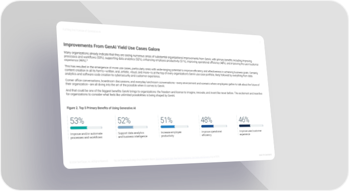 Fulfilling the Promise of Generative AI 7 Improvements From GenAI Yield Use Cases Galore Many organizations already indicate that they are seeing numerous areas of substantial organizational improvements from GenAI, with primary benefits including improving processes and workflows (53%), supporting data analytics (52%), enhancing employee productivity (51%), improving operational efÏciency (48%), and improving the user/customer experience (46%).5 This has resulted in the emergence of more use cases, particularly ones with wide-ranging potential to improve efÏciency and effectiveness in achieving business goals. Certainly, content creation in all its forms—written, oral, artistic, visual, and more—is at the top of every organization’s GenAI use case portfolio, likely followed by everything from data analytics and software code creation to cybersecurity and customer experience. Corner ofÏce conversations, boardroom discussions, and everyday lunchroom conversations—every environment and scenario where employees gather to talk about the future of their organization—are all diving into the art of the possible when it comes to GenAI. And that could be one of the biggest benefits GenAI brings to organizations: the freedom and license to imagine, innovate, and invent like never before. The excitement and incentive for organizations to consider what feels like unlimited possibilities is being shaped by GenAI. Figure 2. Top 5 Primary Benefits of Using Generative AI 53% 52% 51% 48% 46% 3e+7d= 2e+8d= 1e+9d= 8d+2e= 6d+4e= Improve and/or automate Support data analytics Increase employee Improve operational Improve user/customer processes and workflows and business intelligence productivity efÏciency experience © 2024 TechTarget, Inc. All Rights Reserved. 5Source: Enterprise Strategy Group Research Report, Beyond the GenAI Hype: Real-World Investments, Use Cases, and Concerns, August 2023. Back to contents