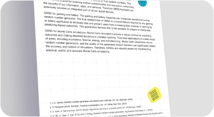 Example Use Cases and Applications of QRNG QRNG has the potential to become the de facto hardware-based random number generator for a wide range of applications, digital services, and devices used in our daily lives. QRNG for cryptography: Cryptographic protocols and algorithms rely on random numbers, and QRNG can provide a trusted source of true random numbers. This makes QRNG crucial for enabling trusted authentication and encryption, enhancing the security of our information, apps, and services. Therefore QRNG hardware can potentially become an integrated part of all our digital devices. QRNG for gaming and lottery: The gaming and lottery industries can immensely benefit from a true random number generator. The true randomness of QRNG is a crucial feature required by any gaming or lottery application to eliminate bias and prevent users from increasing their chances of winning by predicting biased outcomes. This guarantees fairness that is not possible for players to manipulate. QRNG for Monte Carlo simulations: Monte Carlo simulations provide a robust method for predicting outcomes and making informed decisions in complex systems. They have applications in a wide range of areas, including economics, finance, energy, and manufacturing. Monte Carlo simulations rely on random number generators, and the quality of the generated random numbers can significantly impact the accuracy and runtime of simulations. Therefore, QRNGs are valuable assets for implementing practical, useful, and accurate Monte Carlo simulations. ËÙ J. E. Gentle, Random number generation and Monte Carlo methods, Vol. 381 (Springer, 2003).ô ÕÙ N. Ferguson and B. Schneier, Practical cryptography, Vol. 141 (Wiley New York, 2003)Ù ÃÙ V. Vovk, A. Gammerman, and G. Shafer, Algorithmic learning in a random world, Vol. 29 (Springer, 2005)Ù ÐÙ X. Ma, X. Yuan, Z. Cao, B. Qi, and Z. Zhang, Quantum random number generation, npj Quantum Information 2, 1 (2016)Ù »Ù M. Herrero-Collantes and J. C. Garcia-Escartin, Quantum random number generators, Reviews of Modern Physics 89, 015004 (2017)Ù æÙ X. Ma, F. Xu, H. Xu, X. Tan, B. Qi, and H.-K. Lo, Postprocessing for quantum random- number generators: Entropy evaluation and randomness extraction, Physical Review A 87, 062327 (2013)Ù ³Ù C. Bruynsteen, T. Gehring, C. Lupo, J. Bauwelinck, and X. Yin, 100-gbit/s integrated quantum random number generator based on vacuum fluctuations, PRX quantum 4, 010330 (2023). ©Outshift by Cisco 2024 Quantum Random Number Generator 5