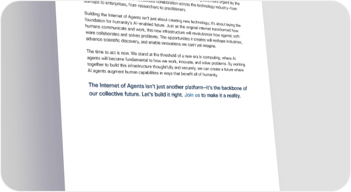 The Internet of Agents Vijoy Pandey, Ph.D January 22, 2025 6. The end of the beginning: A call to action The proliferation of AI agents marks a pivotal moment in technological history. The need for open, secure, and scalable infrastructure to support these agents grows more urgent by the day. Success demands unprecedented collaboration across the technology industry—from startups to enterprises, from researchers to practitioners. Building the Internet of Agents isn’t just about creating new technology; it’s about laying the foundation for humanity’s AI-enabled future. Just as the original internet transformed how humans communicate and work, this new infrastructure will revolutionize how agentic soft- ware collaborates and solves problems. The opportunities it creates will reshape industries, advance scientific discovery, and enable innovations we can’t yet imagine. The time to act is now. We stand at the threshold of a new era in computing, where AI agents will become fundamental to how we work, innovate, and solve problems. By working together to build this infrastructure thoughtfully and securely, we can create a future where AI agents augment human capabilities in ways that benefit all of humanity. The Internet of Agents isn’t just another platform—it’s the backbone of our collective future. Let’s build it right. Join us to make it a reality. Shape the future of AI with us at: outshift.cisco.com/the-internet-of-agents Want to stay updated on next steps? Sign up for our newsletter. There will be more opportunities to get involved coming soon. ©2025 Outshift by Cisco and/or its afÏliates. All rights reserved. 13