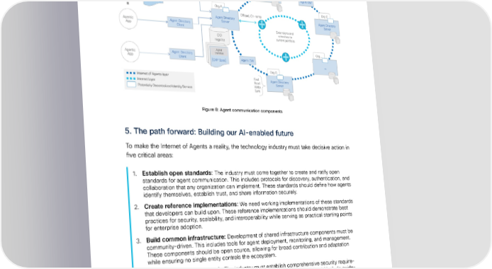 The Internet of Agents Vijoy Pandey, Ph.D January 22, 2025 Figure 8: Agent communication components 5. The path forward: Building our AI-enabled future To make the Internet of Agents a reality, the technology industry must take decisive action in five critical areas: 1. Establish open standards: The industry must come together to create and ratify open standards for agent communication. This includes protocols for discovery, authentication, and collaboration that any organization can implement. These standards should define how agents identify themselves, establish trust, and share information securely. 2. Create reference implementations: We need working implementations of these standards that developers can build upon. These reference implementations should demonstrate best practices for security, scalability, and interoperability while serving as practical starting points for enterprise adoption. 3. Build common infrastructure: Development of shared infrastructure components must be community-driven. This includes tools for agent deployment, monitoring, and management. These components should be open source, allowing for broad contribution and adaptation while ensuring no single entity controls the ecosystem. 4. Define security framework: The industry must establish comprehensive security require- ments that address both current and quantum threats. This framework should include guide- lines for implementing quantum-safe encryption, managing agent permissions, and maintaining security across organizational boundaries. 5. Enable seamless migration: Organizations need clear paths to migrate from current AI implementations to this new infrastructure. This includes tools for transitioning existing AI-native software to agent-based architectures and guidelines for maintaining compatibility during the transition. ©2025 Outshift by Cisco and/or its afÏliates. All rights reserved. 12