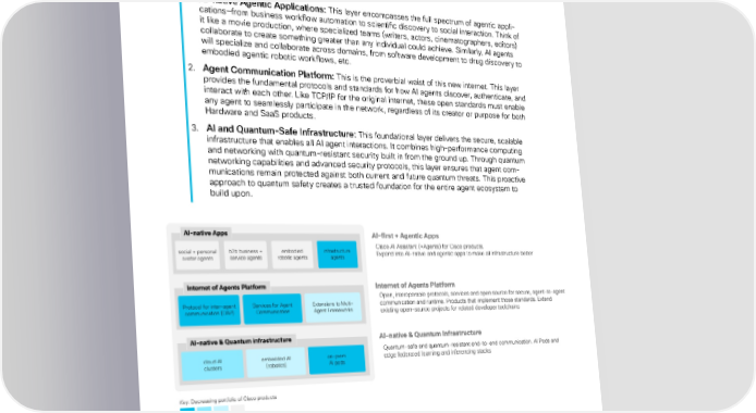 The Internet of Agents Vijoy Pandey, Ph.D January 22, 2025 4. How do we build the Internet of Agents Like the two other internets before (Internet and Cloud Internet), the Internet of Agents will be built on three interconnected layers, each serving a distinct but essential purpose, with 19 a proverbial “waist” — 1. AI-native Agentic Applications: This layer encompasses the full spectrum of agentic appli- cations—from business workflow automation to scientific discovery to social interaction. Think of it like a movie production, where specialized teams (writers, actors, cinematographers, editors) collaborate to create something greater than any individual could achieve. Similarly, AI agents will specialize and collaborate across domains, from software development to drug discovery to embodied agentic robotic workflows, etc. 2. Agent Communication Platform: This is the proverbial waist of this new internet. This layer provides the fundamental protocols and standards for how AI agents discover, authenticate, and interact with each other. Like TCP/IP for the original internet, these open standards must enable any agent to seamlessly participate in the network, regardless of its creator or purpose for both Hardware and SaaS products. 3. AI and Quantum-Safe Infrastructure: This foundational layer delivers the secure, scalable infrastructure that enables all AI agent interactions. It combines high-performance computing and networking with quantum-resistant security built in from the ground up. Through quantum networking capabilities and advanced security protocols, this layer ensures that agent com- munications remain protected against both current and future quantum threats. This proactive approach to quantum safety creates a trusted foundation for the entire agent ecosystem to build upon. Figure 6: Net-new products need to be built for the purple (Internet of Agents) layer, and existing products need to be extended for the blue (Internet) layer, driving a refresh across our portfolio Figure 7: The three planes of the Internet of Agents with the proverbial “waist” 19 The waist is a layer of abstraction to simplify K x M x N x .. interactions through a common layer, also known as the Perl- is-Thomson principle. It used to be “IP” in the Internet, moved up to “HTTPS/gRPC/Open API” in the Cloud Internet. ©2025 Outshift by Cisco and/or its afÏliates. All rights reserved. 10