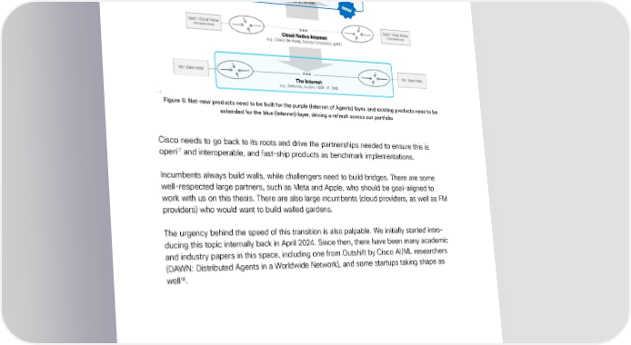 The Internet of Agents Vijoy Pandey, Ph.D January 22, 2025 Figure 6: Net-new products need to be built for the purple (Internet of Agents) layer, and existing products need to be extended for the blue (Internet) layer, driving a refresh across our portfolio Cisco needs to go back to its roots and drive the partnerships needed to ensure this is 17 open and interoperable, and fast-ship products as benchmark implementations. Incumbents always build walls, while challengers need to build bridges. There are some well-respected large partners, such as Meta and Apple, who should be goal-aligned to work with us on this thesis. There are also large incumbents (cloud providers, as well as FM providers) who would want to build walled gardens. The urgency behind the speed of this transition is also palpable. We initially started intro- ducing this topic internally back in April 2024. Since then, there have been many academic and industry papers in this space, including one from Outshift by Cisco AI/ML researchers (DAWN: Distributed Agents in a Worldwide Network), and some startups taking shape as 18 well . 17 The new Open is open source, though there is a need for a communication protocol that we may need to drive in the standards bodies, preferably IETF, as well. 18 Work by Ion Stoica and UC Berkeley, Tsinghua University and Tencent, DAWN by Cisco, talks by Amazon and IBM at Tech- Crunch Disrupt ’24, startups like Lyzr, and also LangGraph trying to extend into this space but currently very far from it. ©2025 Outshift by Cisco and/or its afÏliates. All rights reserved. 9